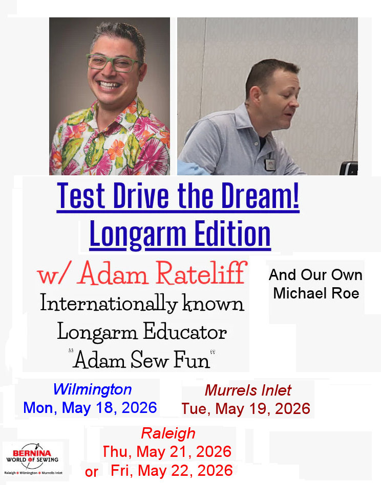 If you are considering a BERNINA and/or bernette Machine-purchase soon: Take advantage of the current machine availability and in-store pricing as well as as-long-as-available GiftsWithPurchase. Call the store (919 782 2945) to arrange a Try-Before-Buy session.