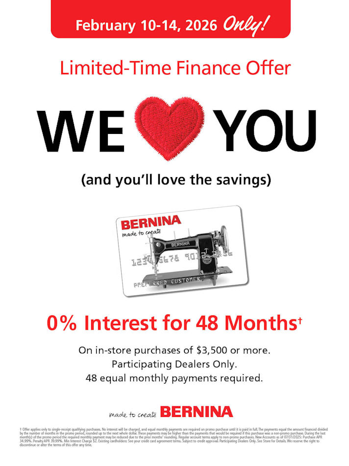 *48 months on purchases as shown above using your BERNINA Credit Card. Equal Monthly Payments Required: February 10-14, 2026.