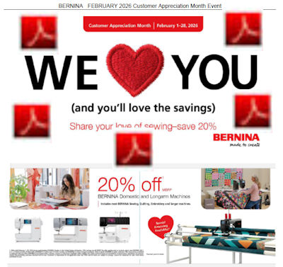 If you have questions about any of the above, please eMail us at: send mail to: CurrentSpecials at Bernina World of Sewing dot com