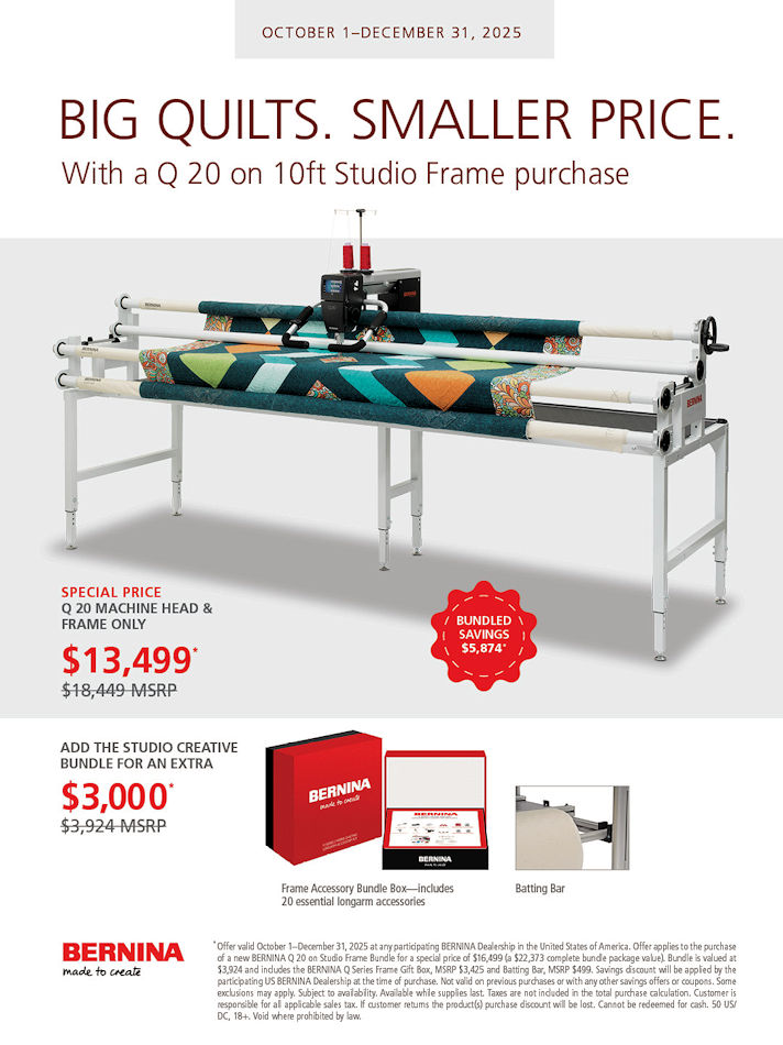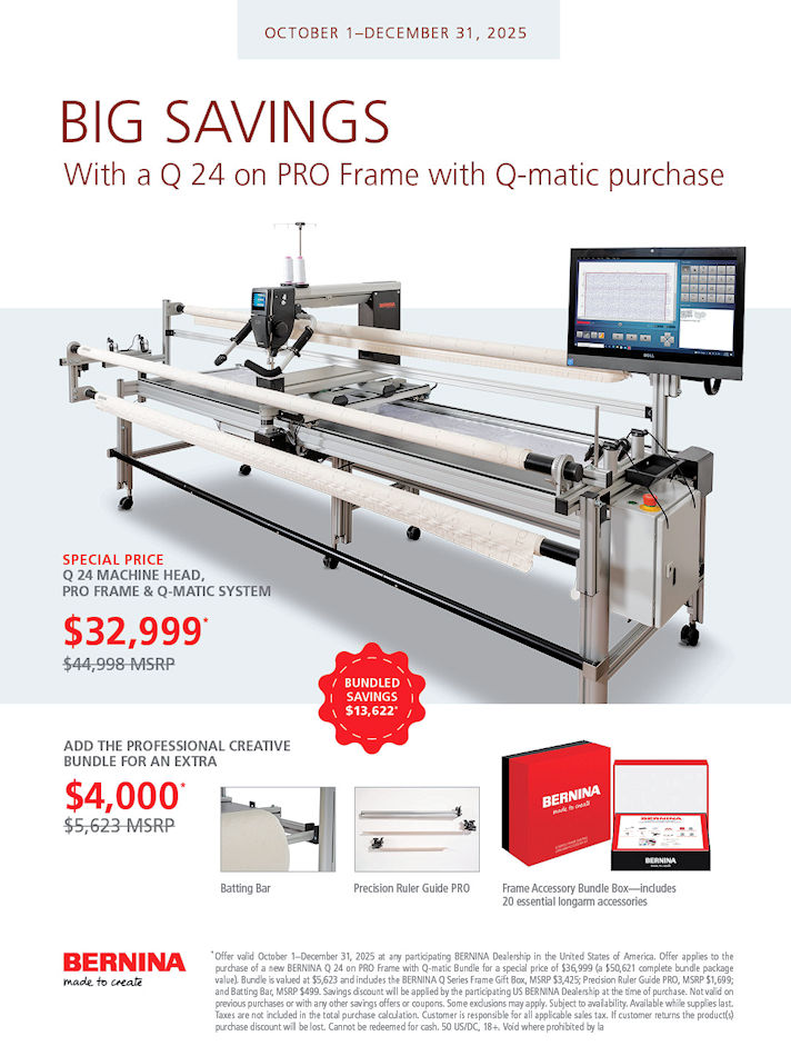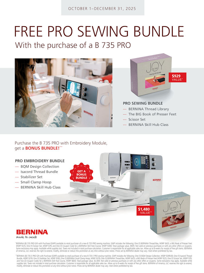 If you are considering a BERNINA and/or bernette Machine-purchase soon: Take advantage of the current machine availability and in-store pricing as well as as-long-as-available GiftsWithPurchase. Call the store (919 782 2945) to arrange a Try-Before-Buy session.