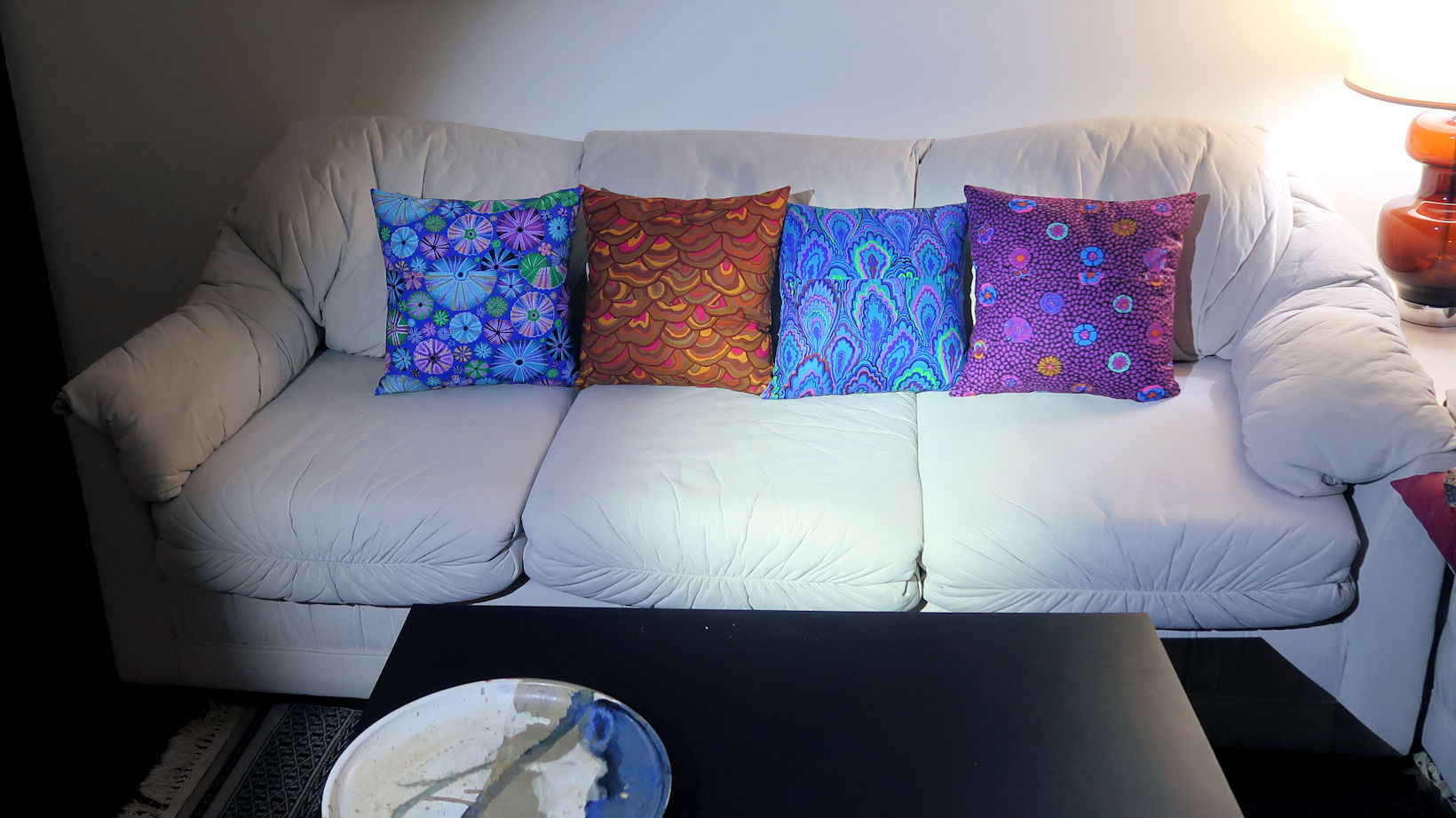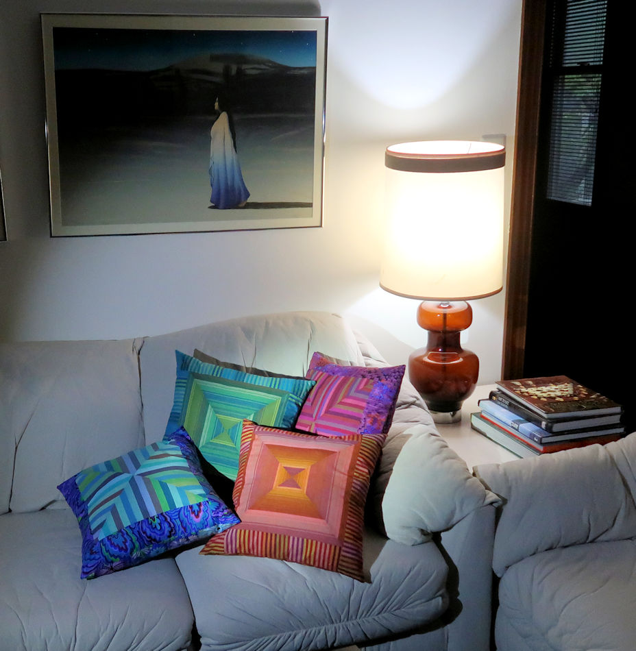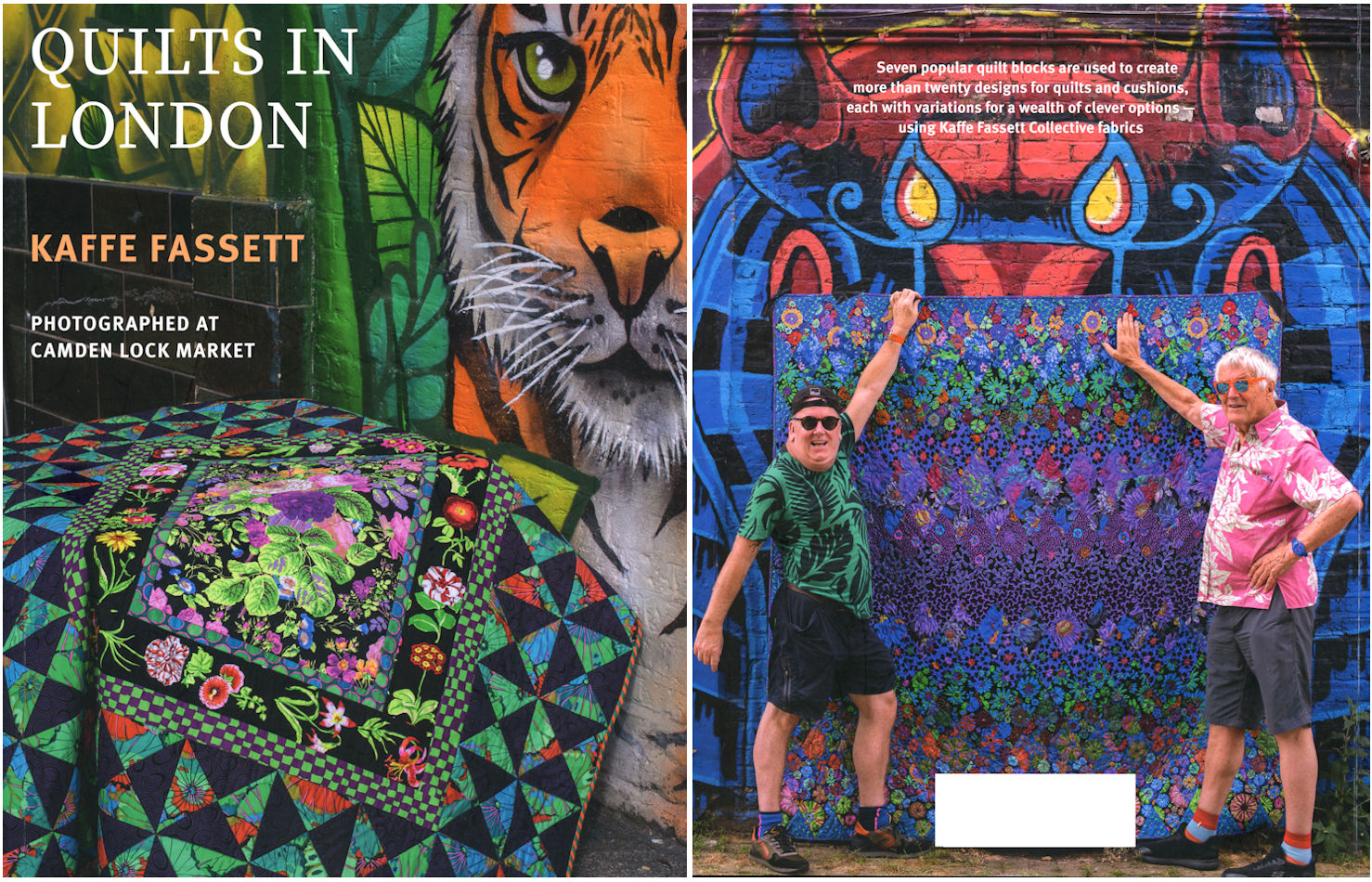 I was fortunate to work alongside the making of the pillows featured in Kaffe's latest book. It was fun to see the fabric/results-of come forth and see some comparison to a 2013 quilt and its fabric inspired from Kaffe's 2013 book: "Shots and Stripes".