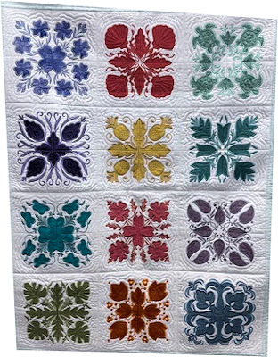 This quilt done originally in greenish/blue tones captures the color and mood of an expanse of the ocean with its crystal-clear water and colors that seem to shift with its depth, tide, and breeze. For those of us who love the sea, it is exquisite in its intricacy.
