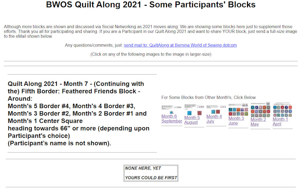 send an eMail to: QuiltAlong2021 at Bernina World of Sewing dotcom - Just Click Here to send the eMail