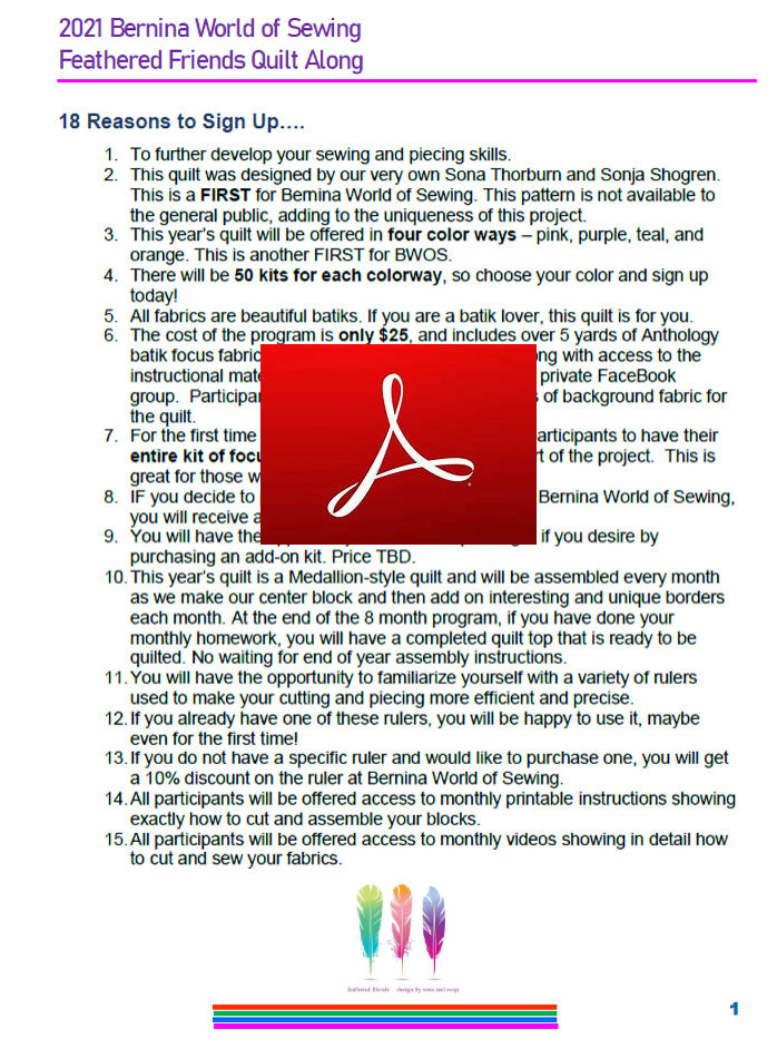 Due to demand -- and as a service to you - the store offered those of you who may have missed the 2021 sign-up window a chance to "Share The Journey" of the 2021 Feathered Friends Quilt Along. You purchase the pattern only and use what fabric Colorway YOU decide for your piece (The pattern is based upon your using four shades: -- Dark, Medium, Lt-Medium and Light -- of one "Colorway" plus your Background fabric -- all of which combination YOU come up with).