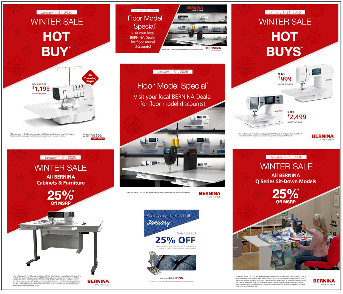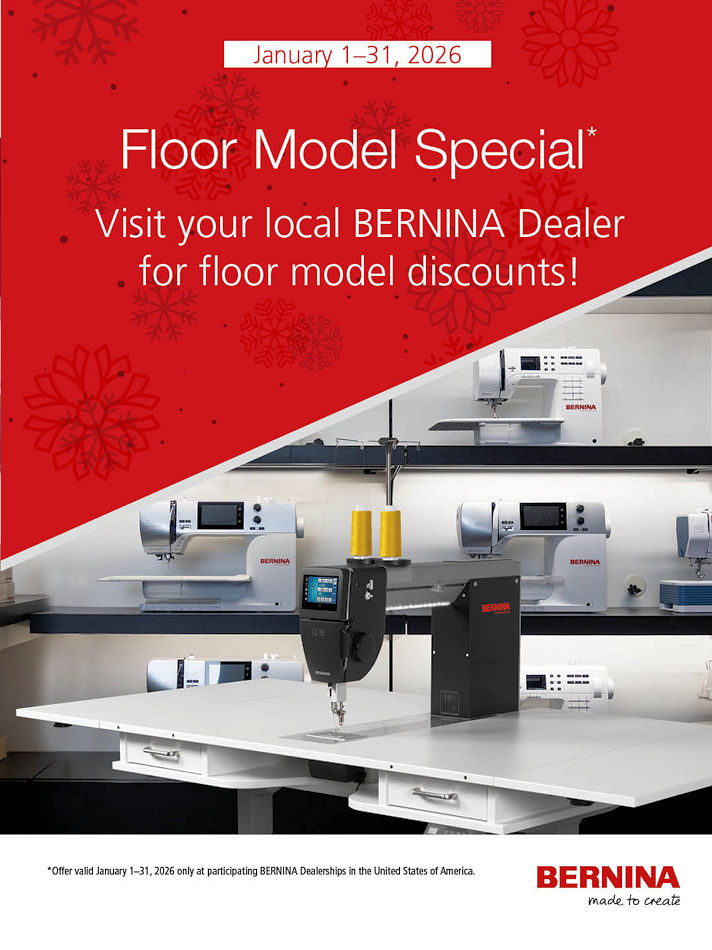 Machine Sale in-store Availability and Prices will never be better than NOW. Machine availability is a challenge - however, BERNINA and bernette machines are coming in daily and we have great machines for you to try; call or eMail us with a request for a sit-together time at the store.