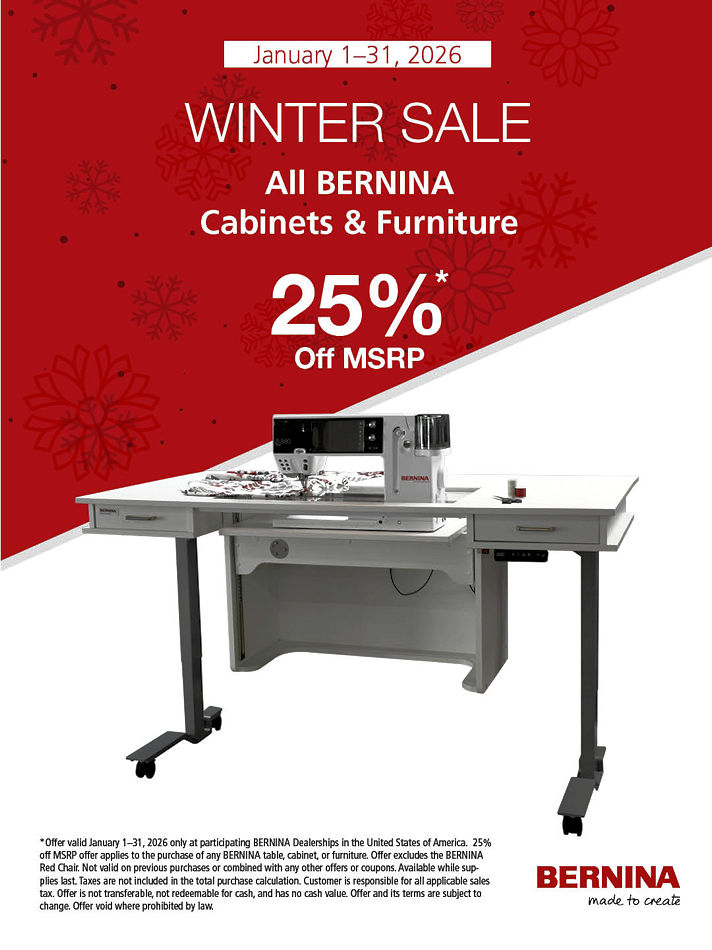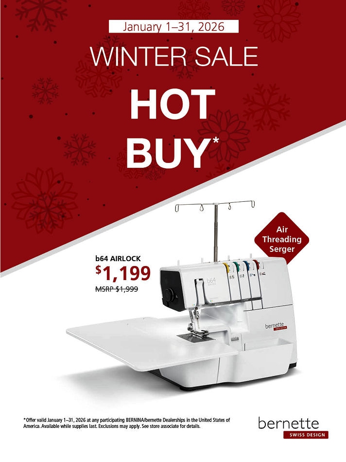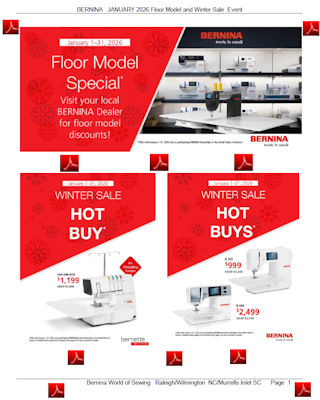 If you are considering a BERNINA and/or bernette Machine-purchase soon: Take advantage of the current machine availability and in-store pricing as well as as-long-as-available GiftsWithPurchase. Call the store (919 782 2945) to arrange a Try-Before-Buy session.