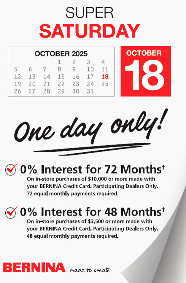*48 or **72 months on purchases as shown above using your BERNINA Credit Card. Equal Monthly Payments Required: October 18, 2025.